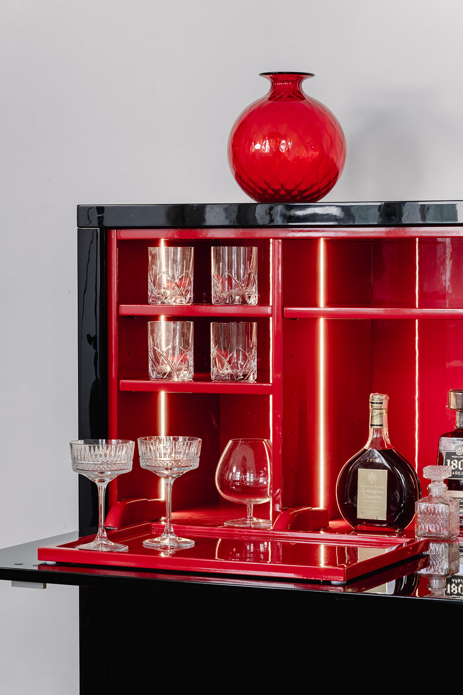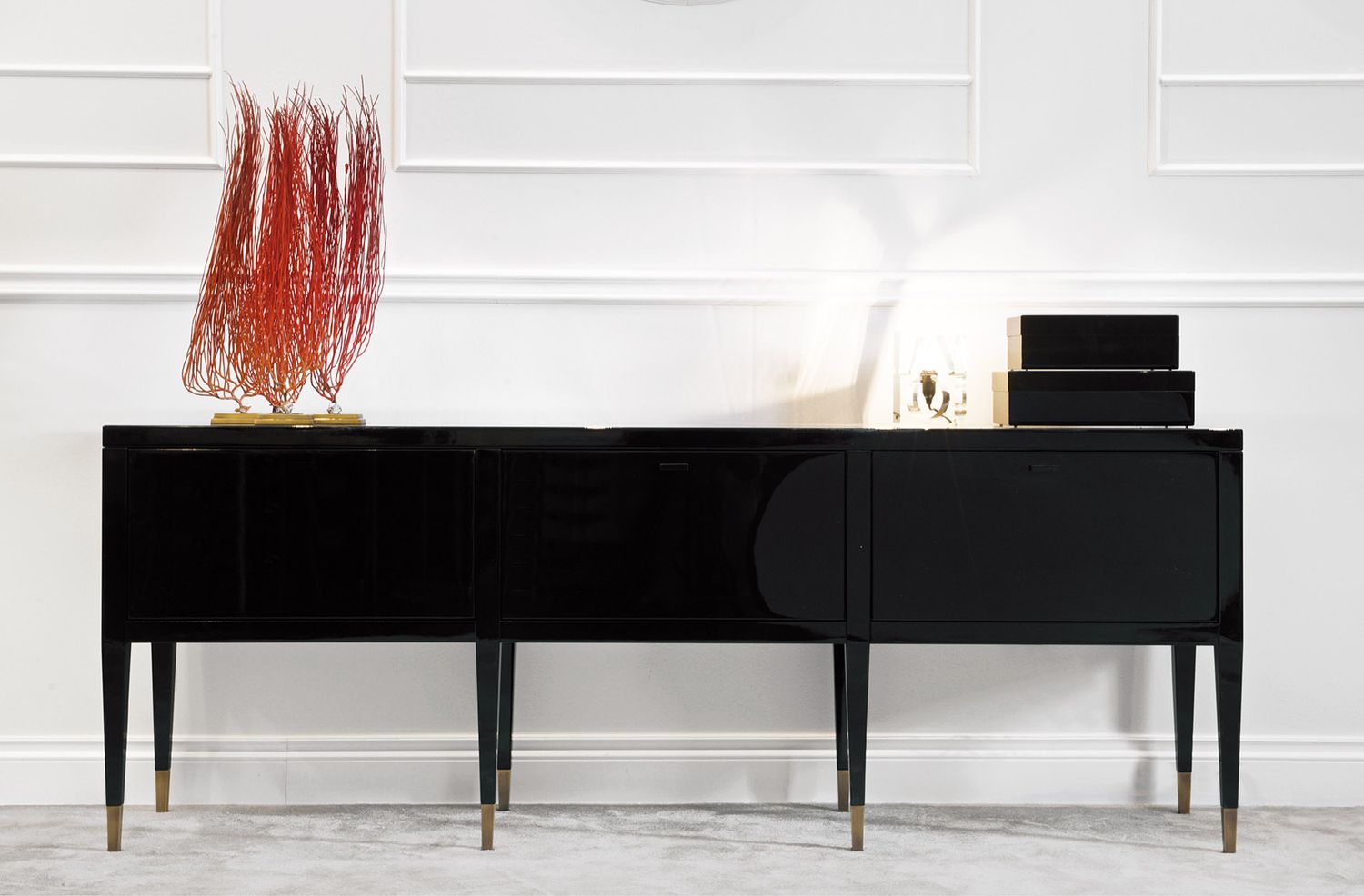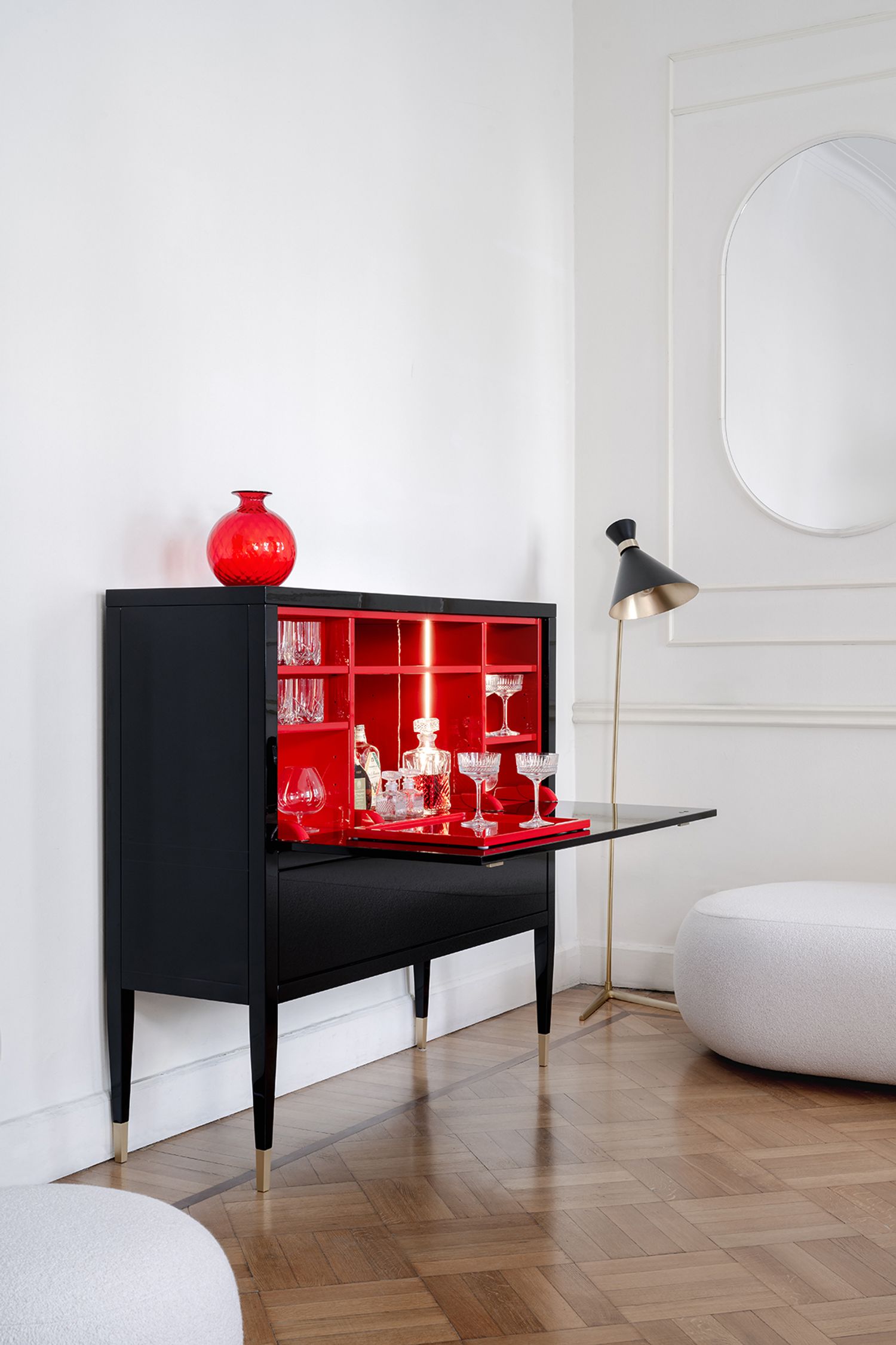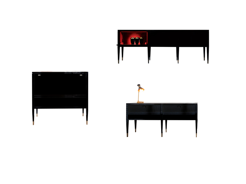 La famiglia di mobili Tanguy include un mobile basso a due o tre ante e un mobile bar.