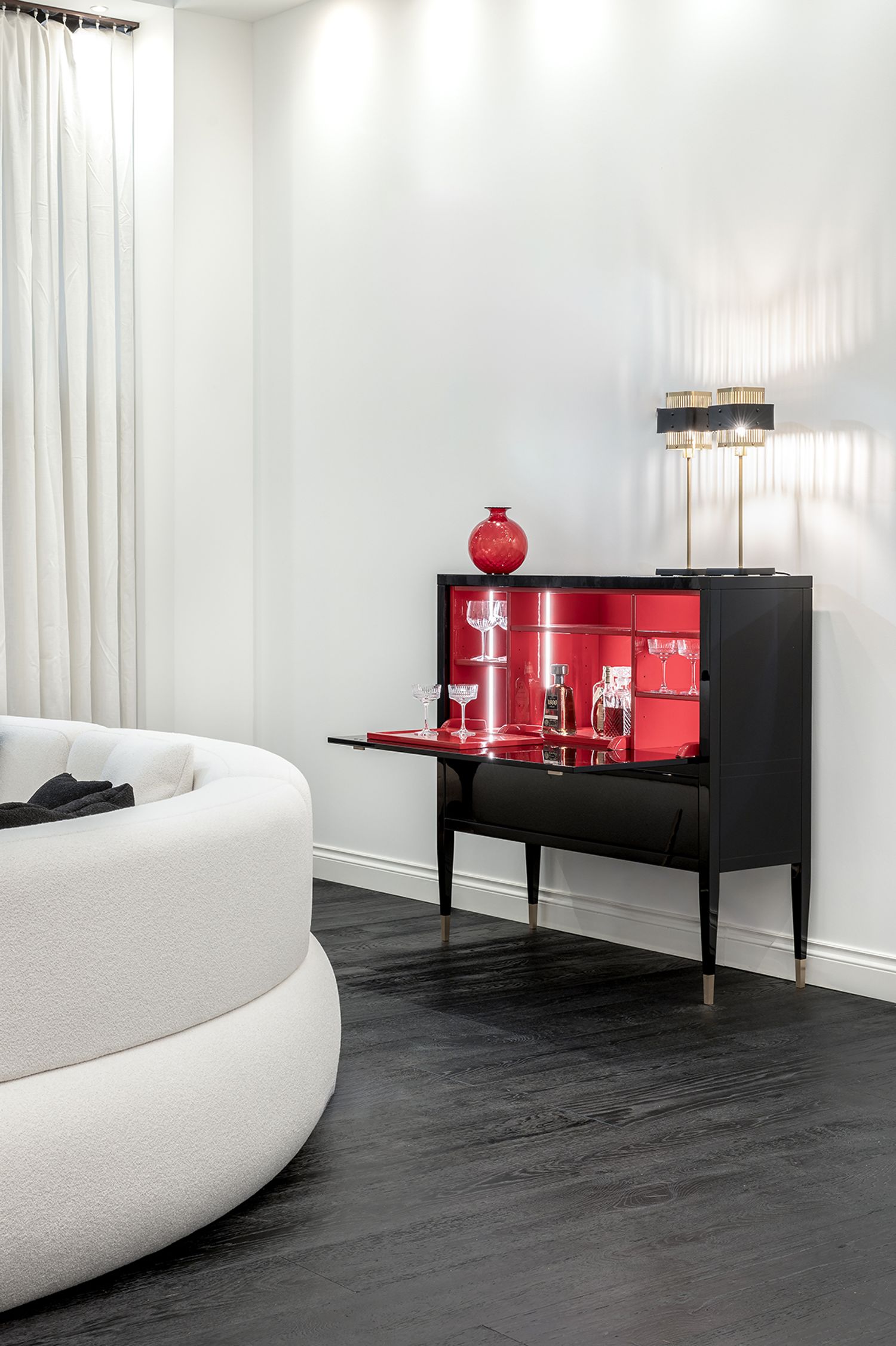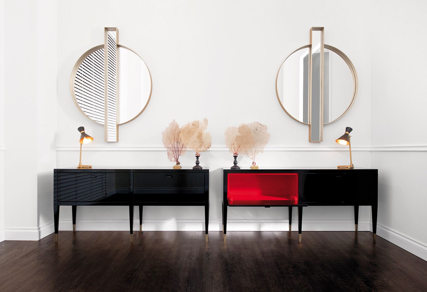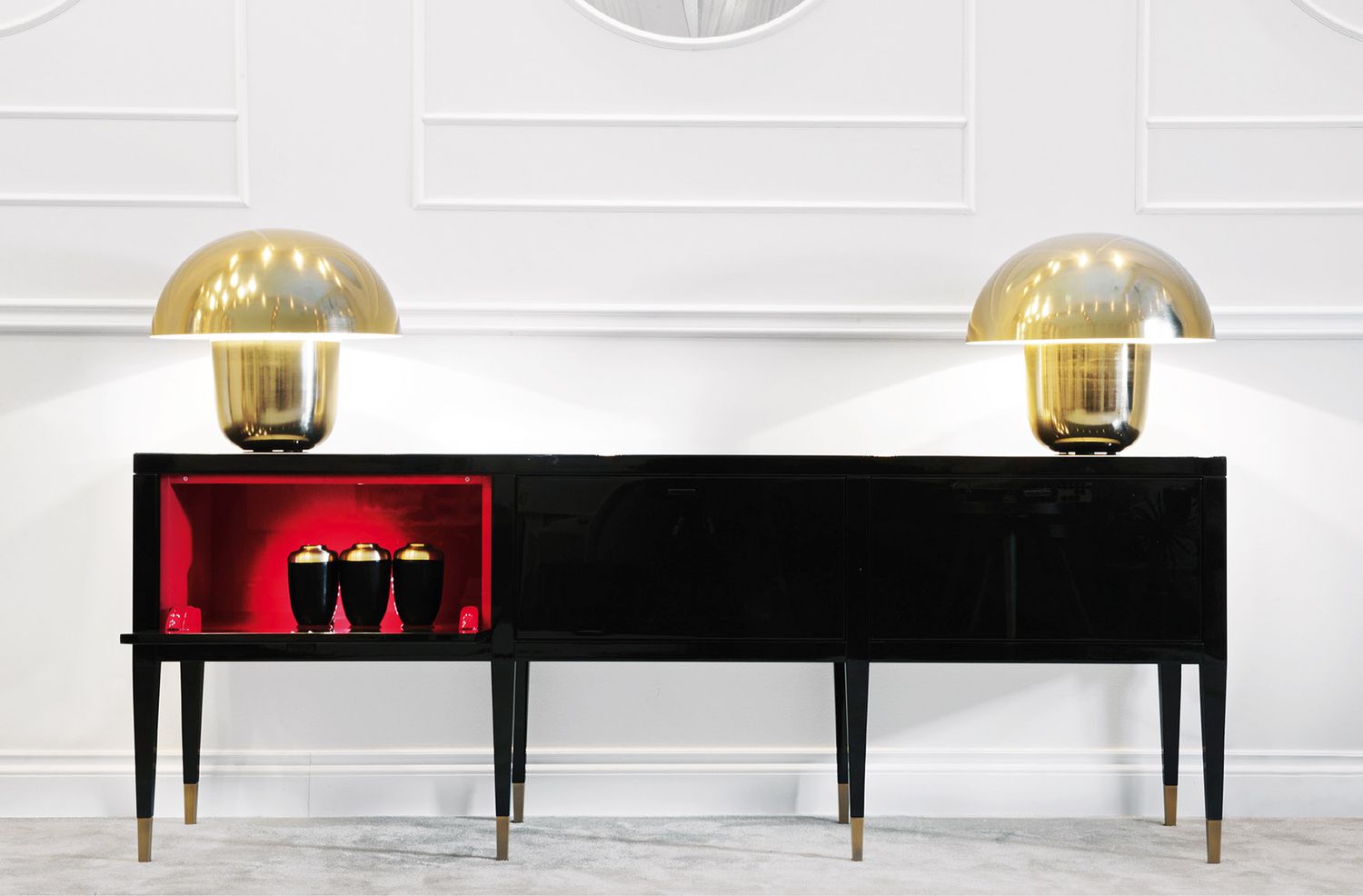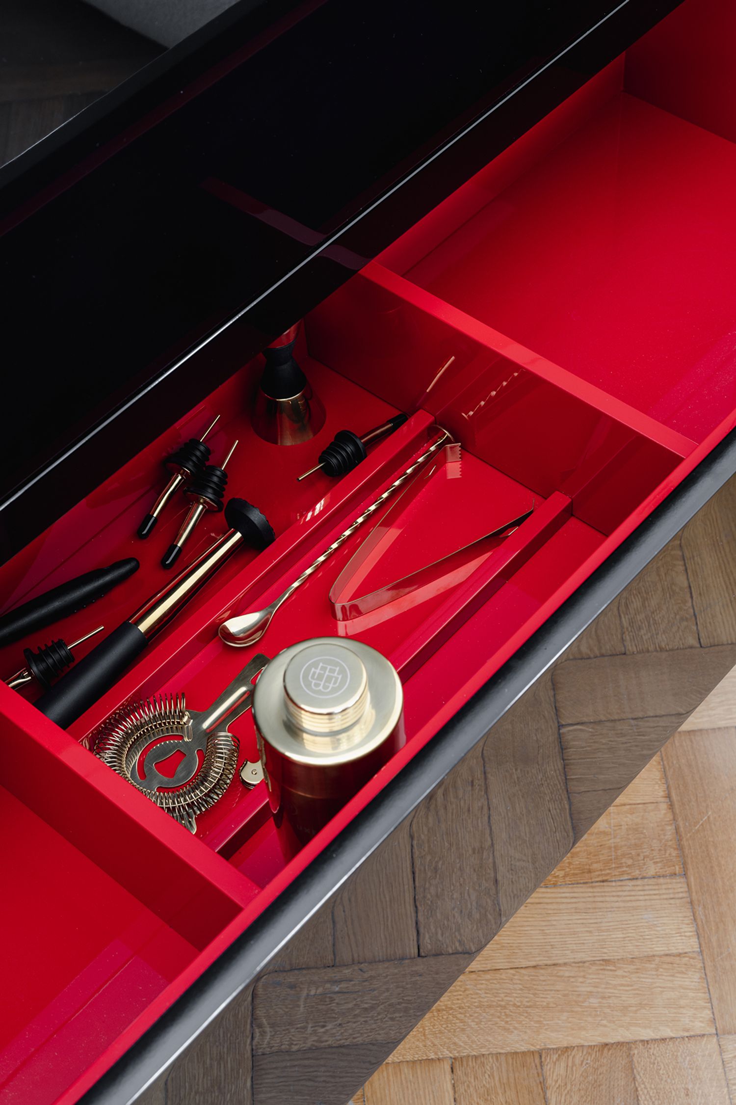 La famiglia di mobili Tanguy include un mobile basso a due o tre ante e un mobile bar.