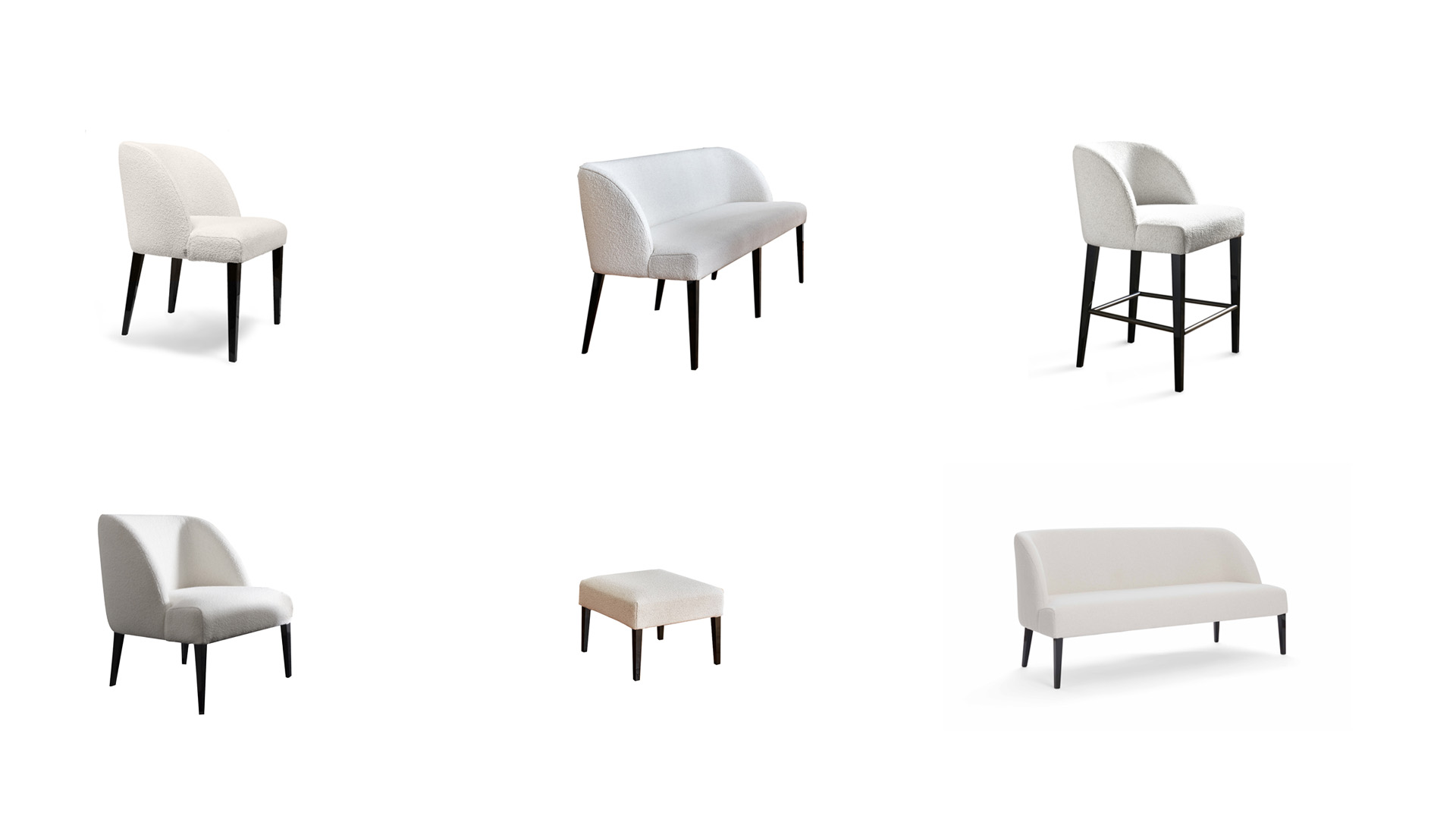 La famiglia di sedute Colette include: la sedia da pranzo e la panca da pranzo; lo sgabello, il divanetto, la poltroncina e il pouf.
