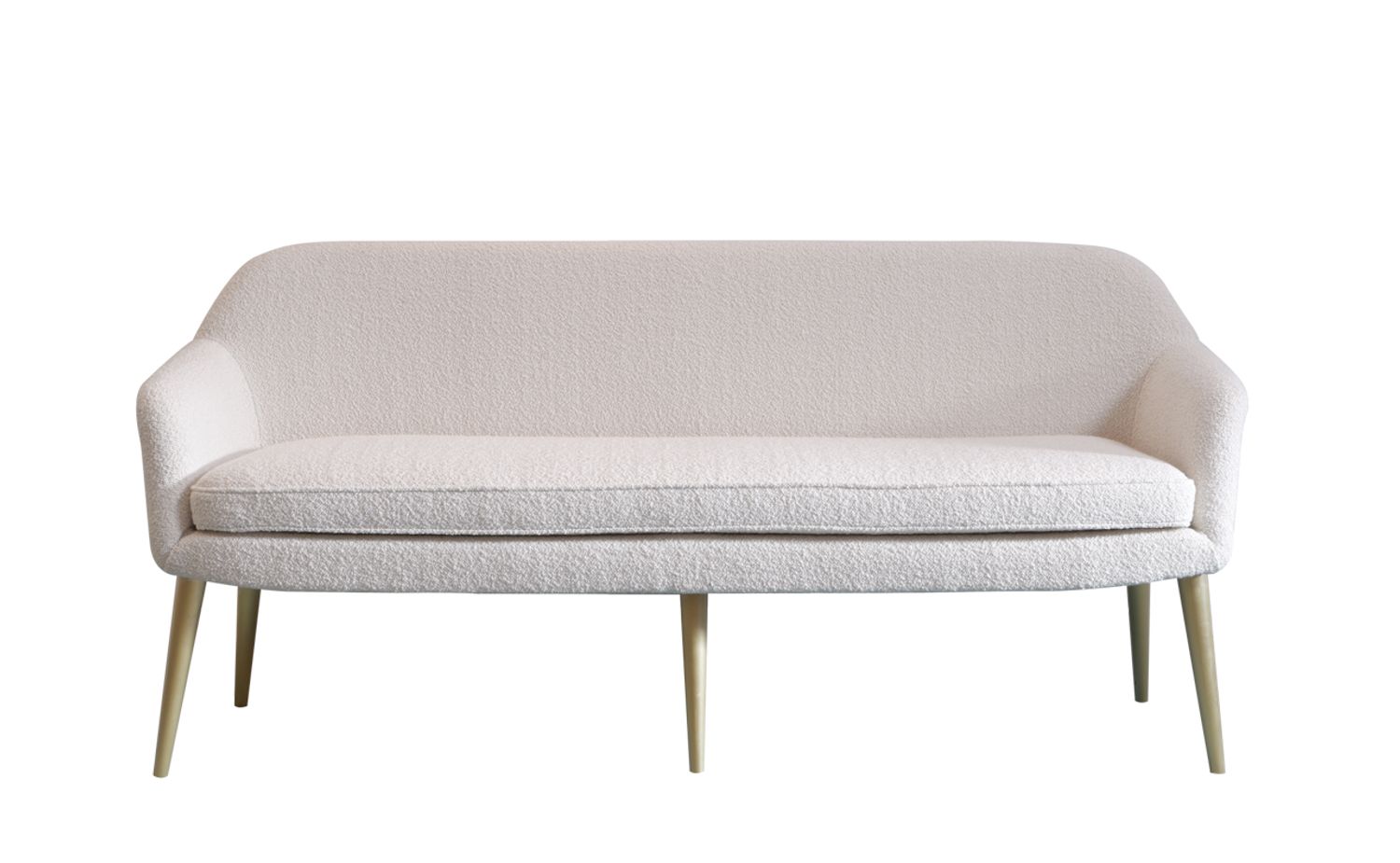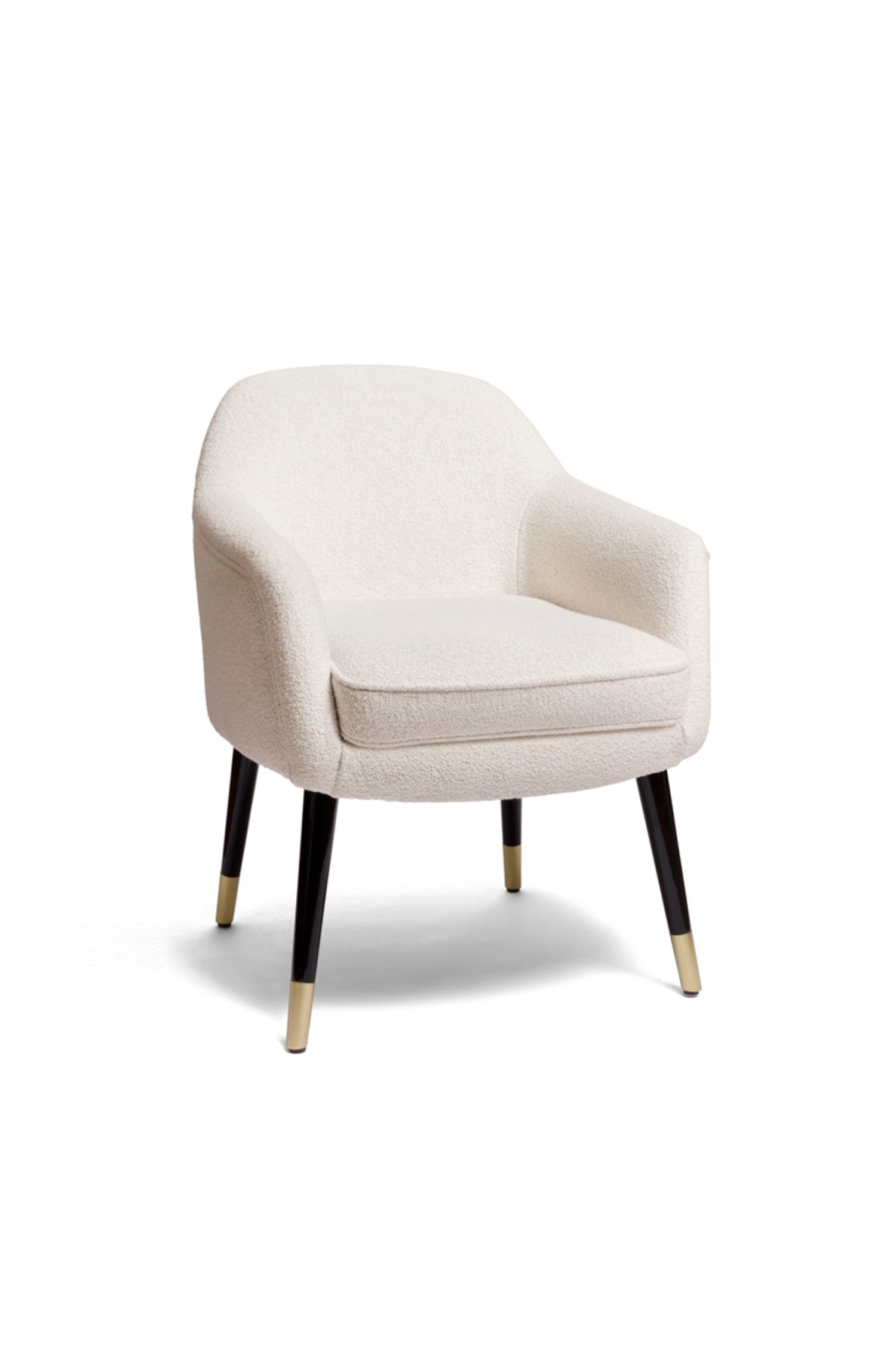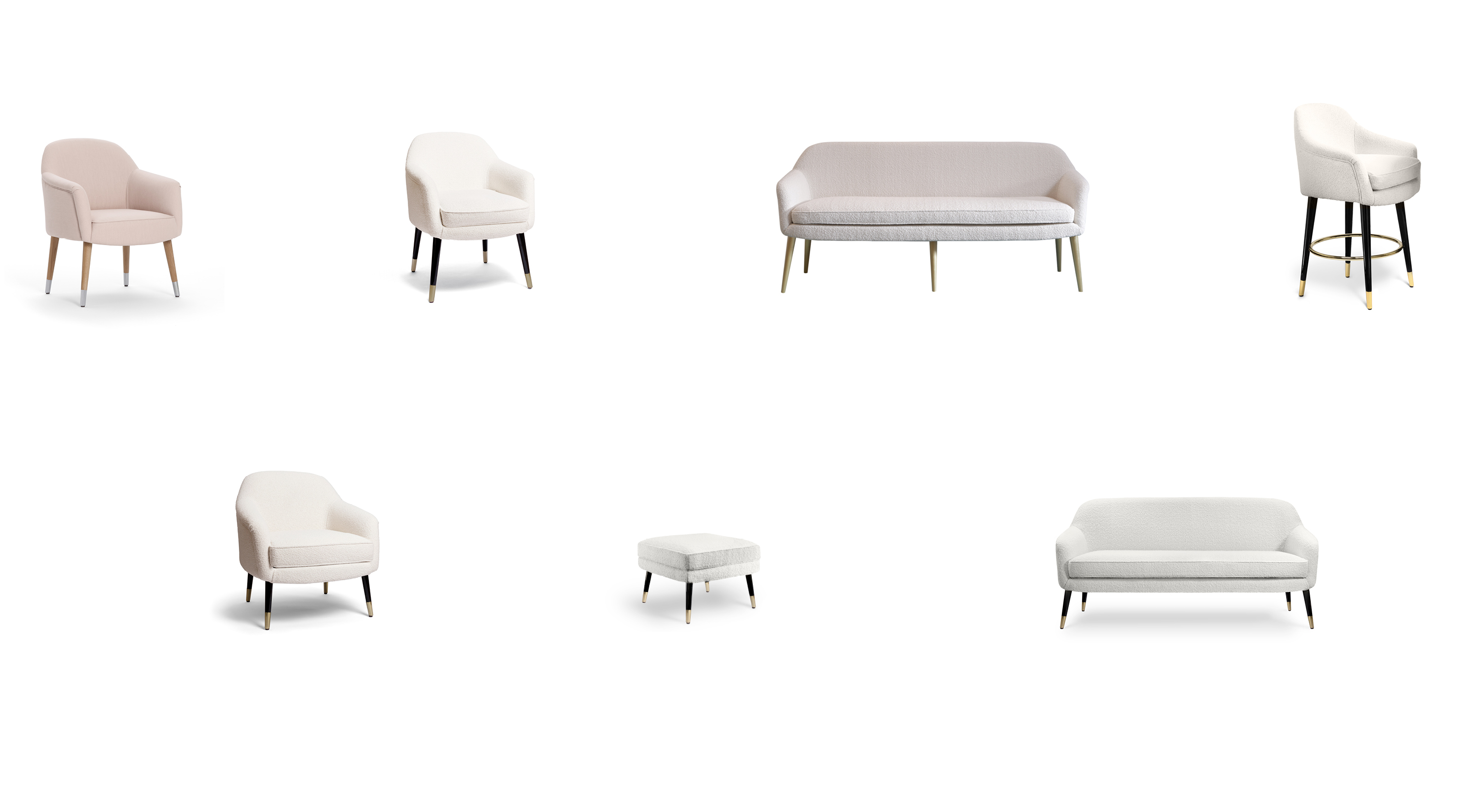 La famiglia di sedute Bernadette include la sedia da pranzo e la panca da pranzo, lo sgabello, il divanetto, la poltroncina e il pouf.