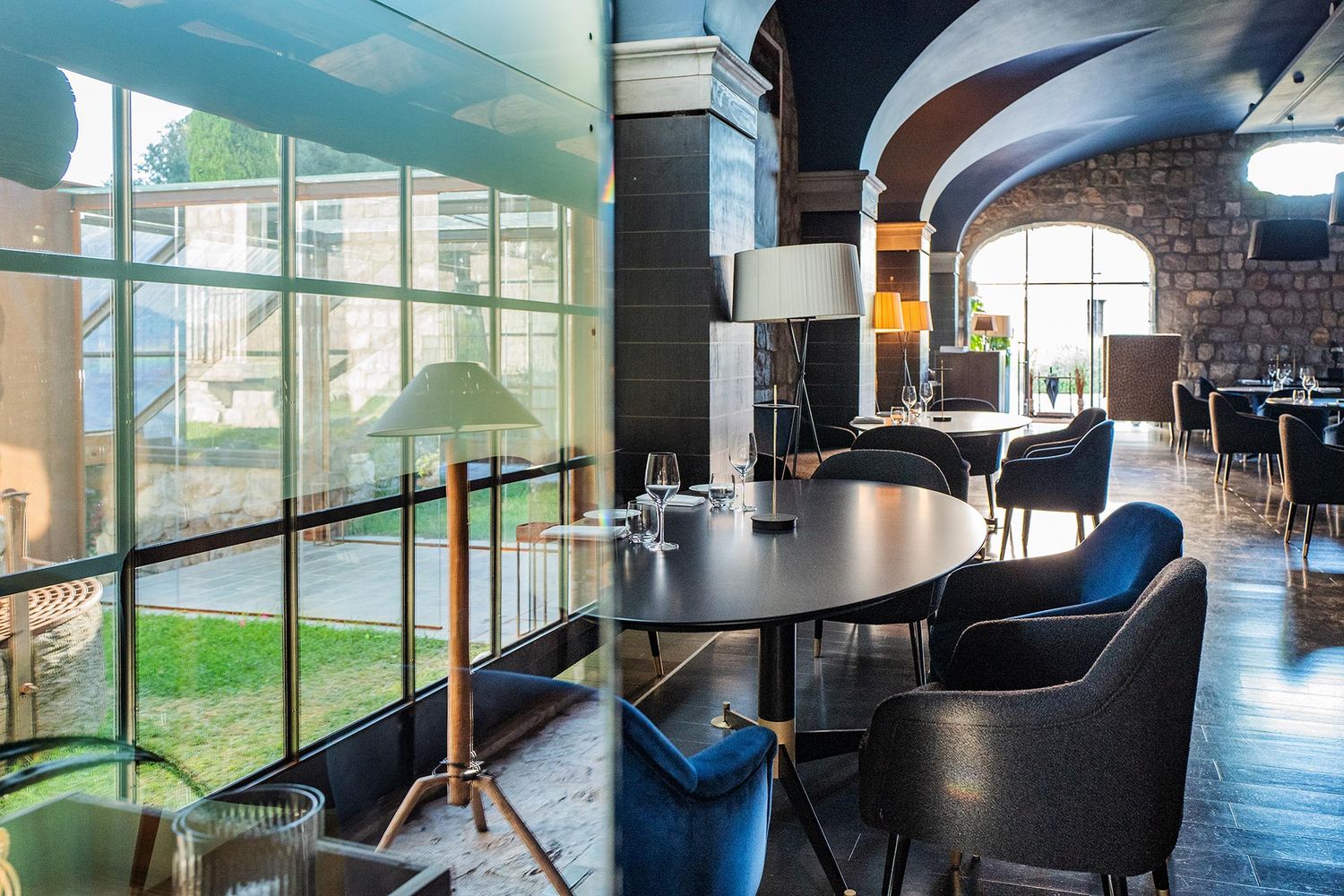 La pietra calcarea, il legno, il cotto creano atmosfere calde e accoglienti. La luce ha un ruolo da protagonista: grazie alle strutture vetrate, interno ed esterno si fondono, offrendo un costante dialogo con la natura.
